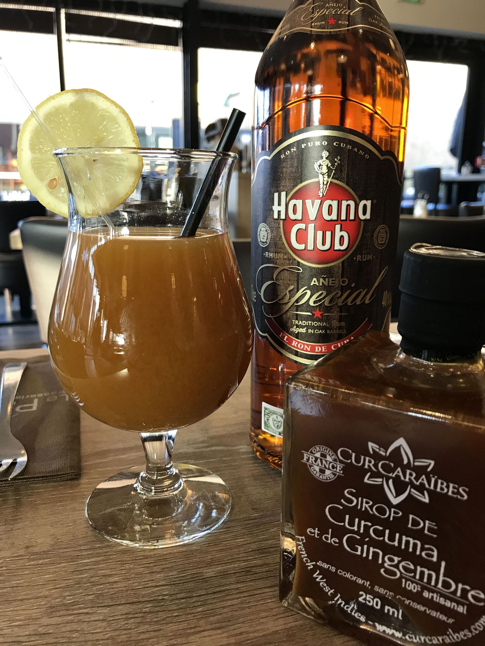 (Thé Ceylan, sirop de curcuma - gingembre, fruits de la passion, rhum Havana, sirop de canne)